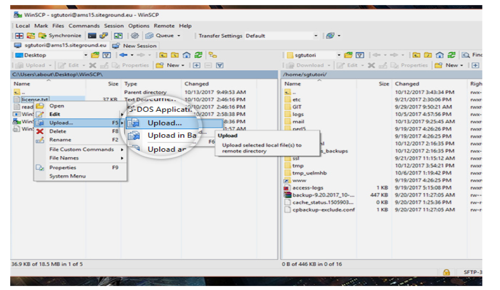 To upload files or folders on your hosting account you just need to navigate to the desired file or folder on the left side panel, right click on the item you want to upload and click Upload to your ~/home. Or you can just drag and drop from left to right and vice versa the desired file