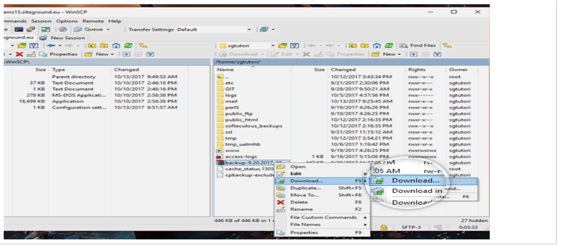 To download navigate to the location of the file or folder you want to download from the right side panel, right click the desired item and select Download -> Download. Or you can draw and drop from the host server to your desktop desired folder.