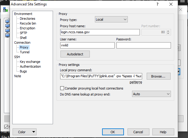 Local proxy command: “C:\\Program Files\\PuTTY\\plink.exe” -pw %pass -l %user %proxyhost direct %host